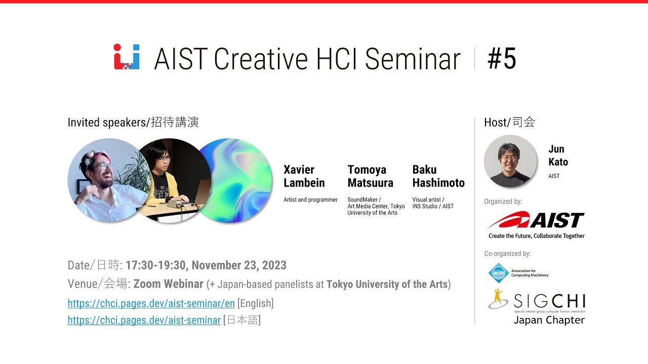 AIST Creative HCI Seminar #5 https://chci.pages.dev/aist-seminar/en/5 The seminar's fifth edition will be held on November 23 (Thu), 2023 . For the f